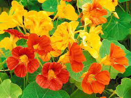 A vibrant mix yellow, orange, red and a few peach flowers on vining plant. Flowers and leaves have a sweet spicy flavor and are a lovely addition to a summer salad.