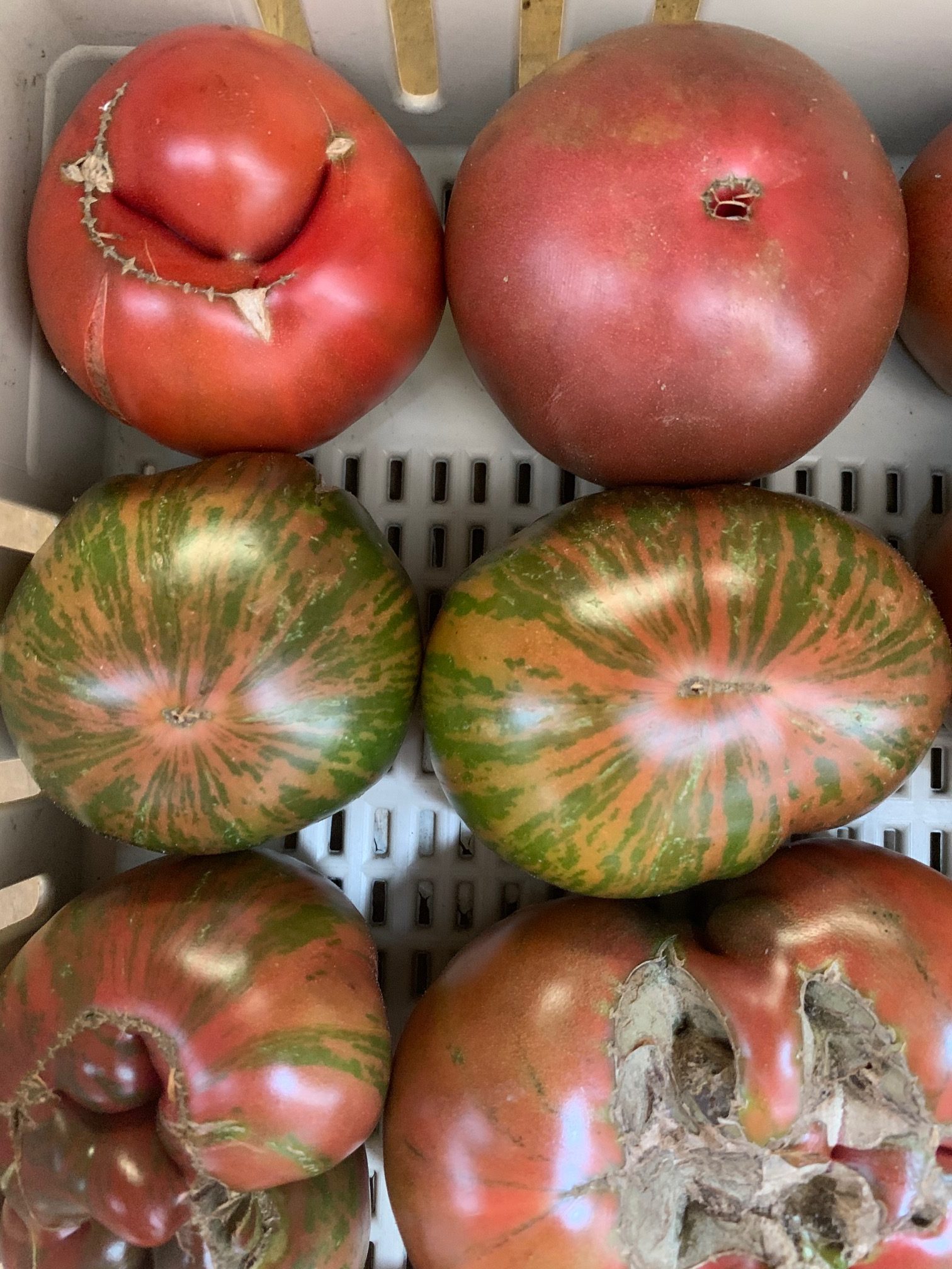 Heirloom type, dark pink fruit with green striping. Delicious, early and produce for a long time thanks to strong disease resistance.